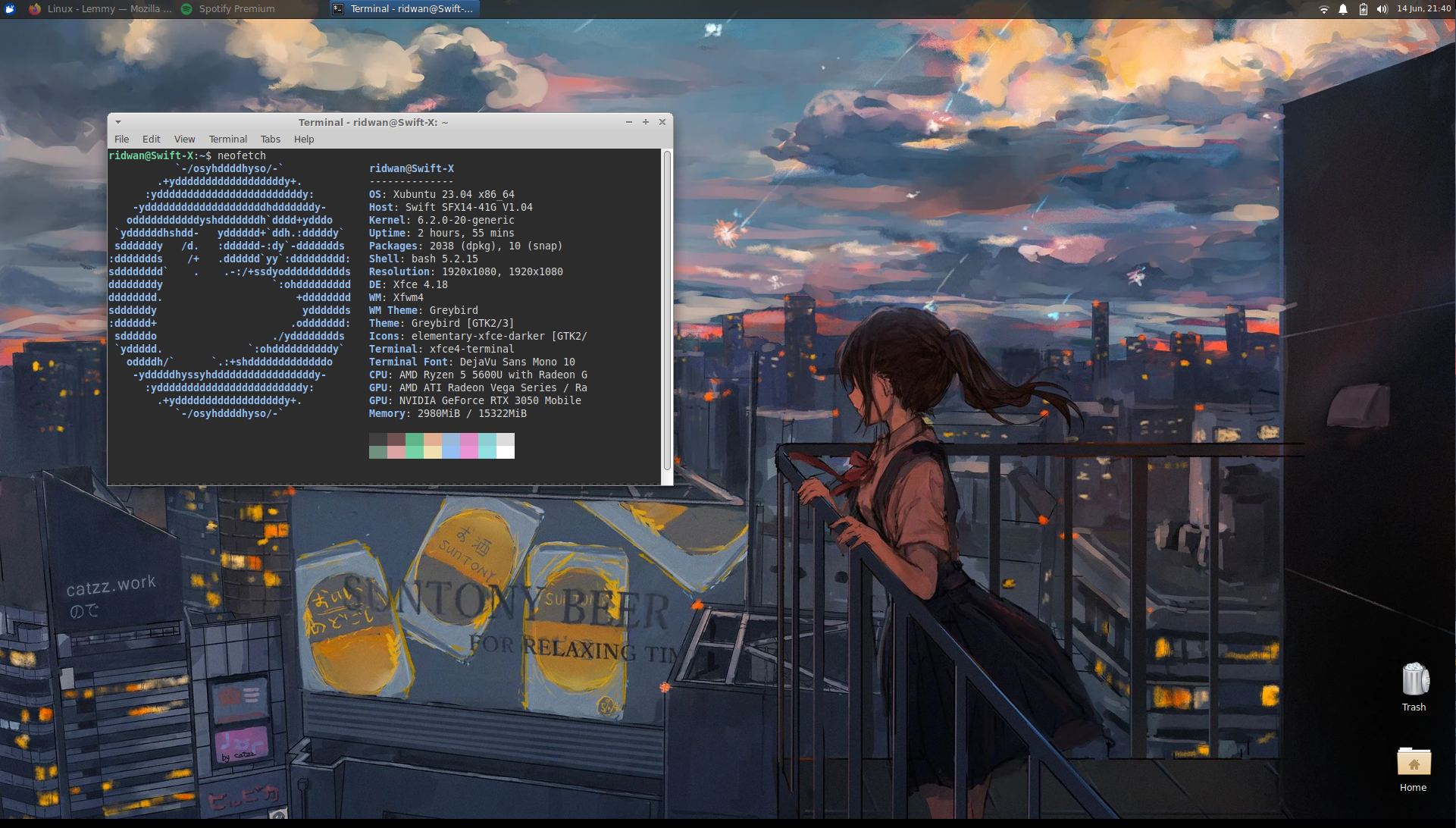 Your desktop looks like that anime girl is staring at that ominous terminal, displaying neofetch while floating in the middle of her city