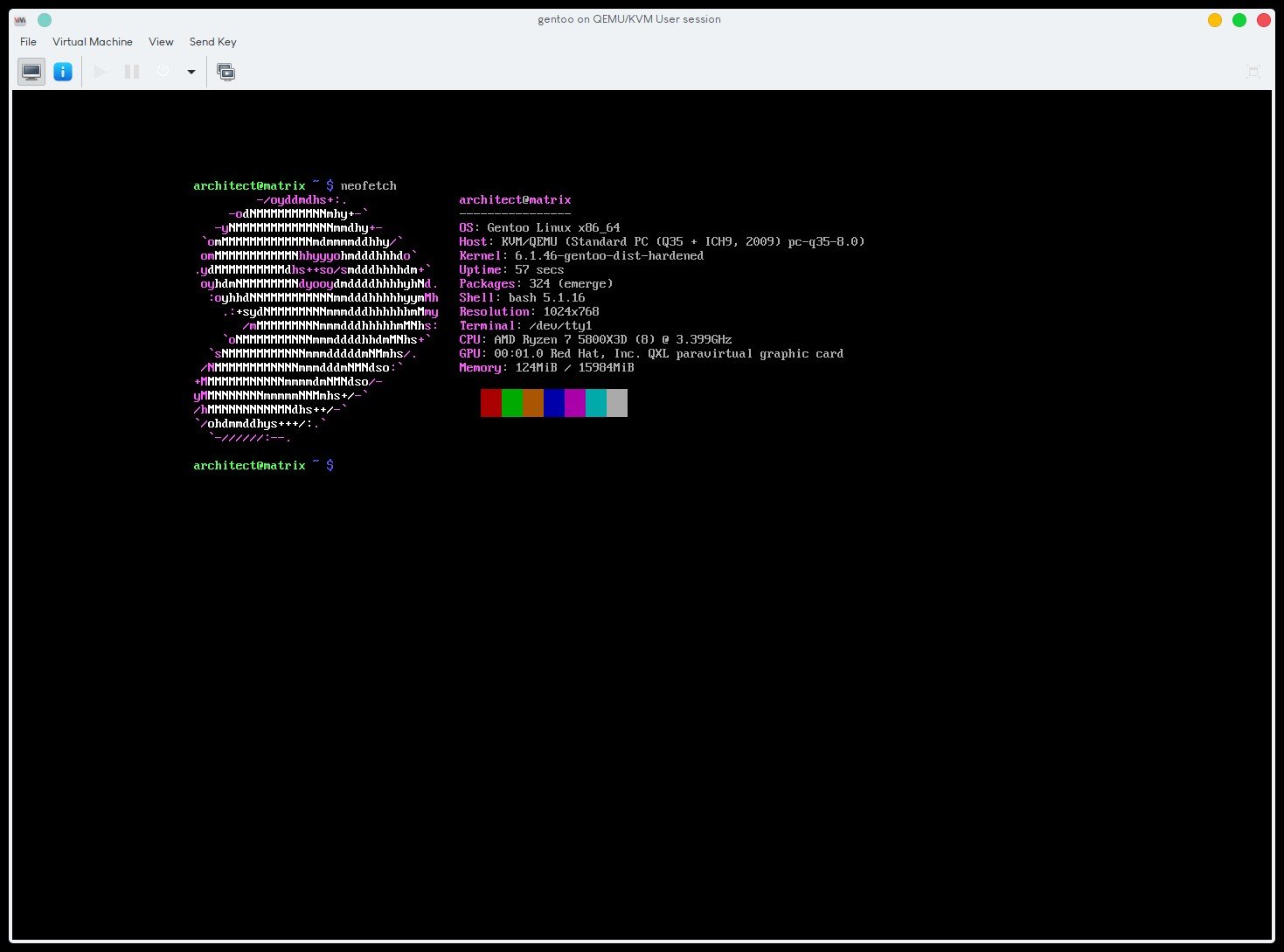 Screenshot of QEMU VM showing an ASCII Gentoo Logo + system info