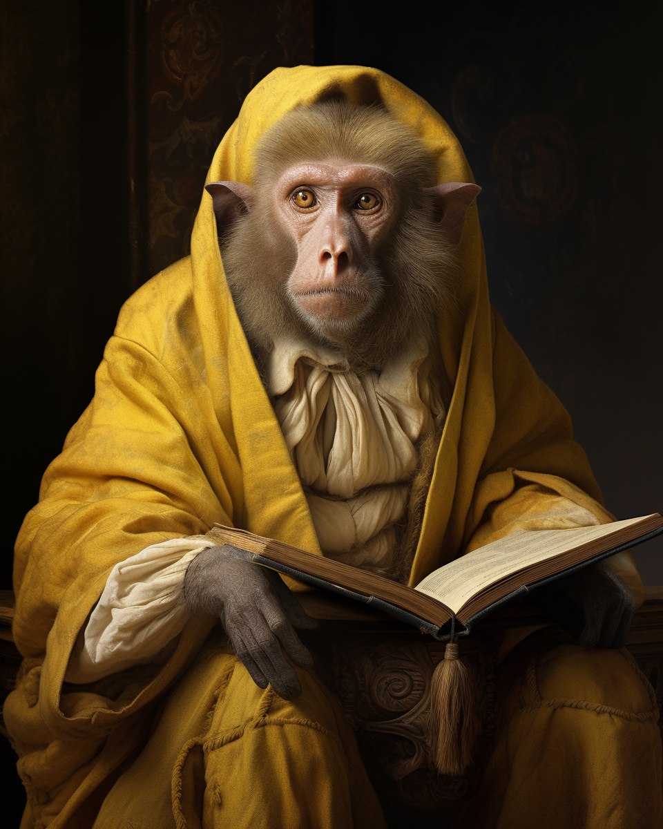An old painting with a common yellow baboon in ruffles and medieval clothes with the ancient folio, with the paws fully draped with folds of clothing, in style of Marinus van Reymerswale, in high resolution, very detailed, 8k - AI: Midjourney V5.2