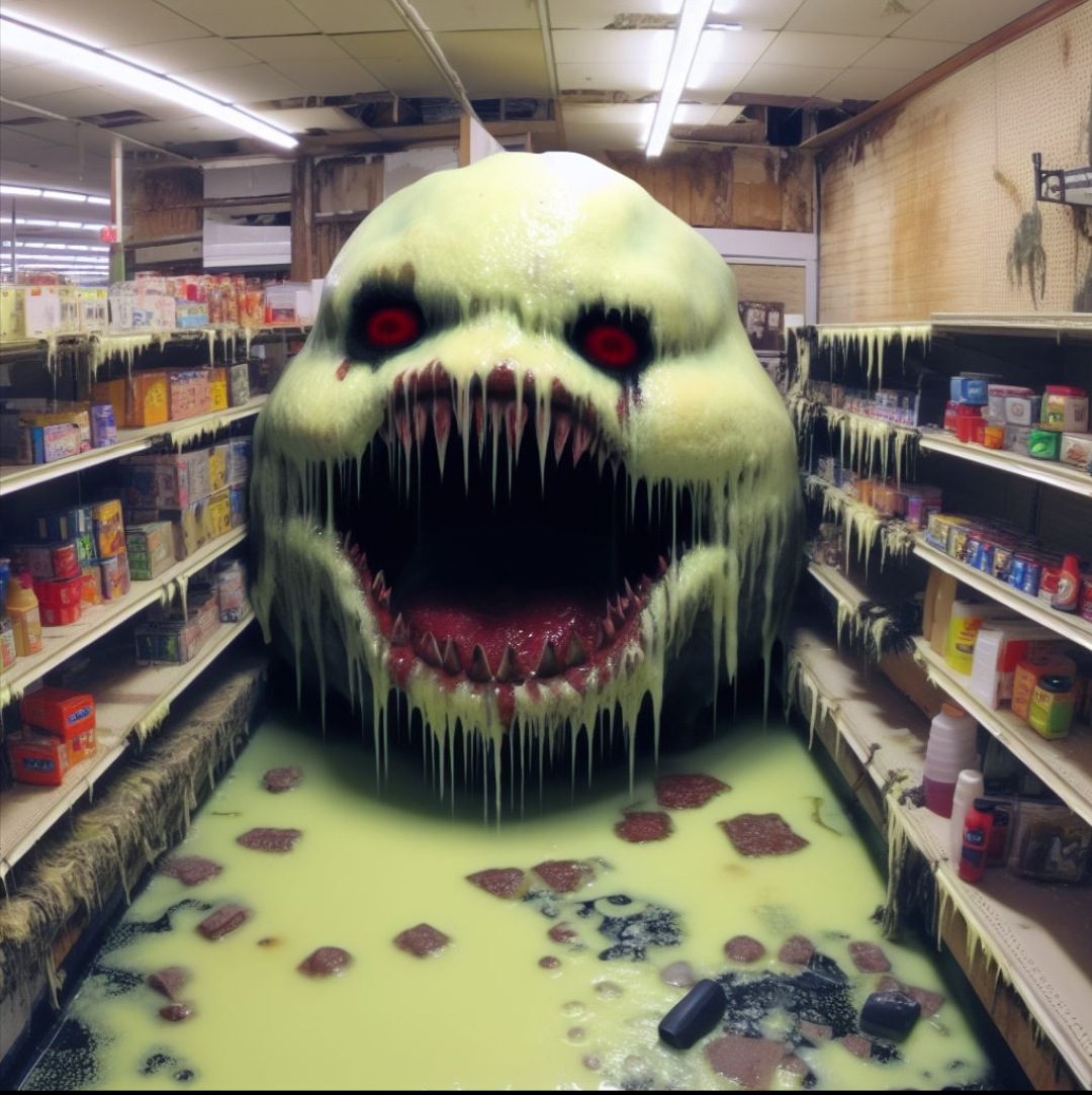 At first, the slime is just a puddle on the floor, but as it absorbs spills and discarded foods, it begins to grow—morphing into a monstrous, ravenous blob with a gaping maw full of razor-sharp teeth. The creature slithers along the aisles, consuming everything in its path, growing larger with every bite.