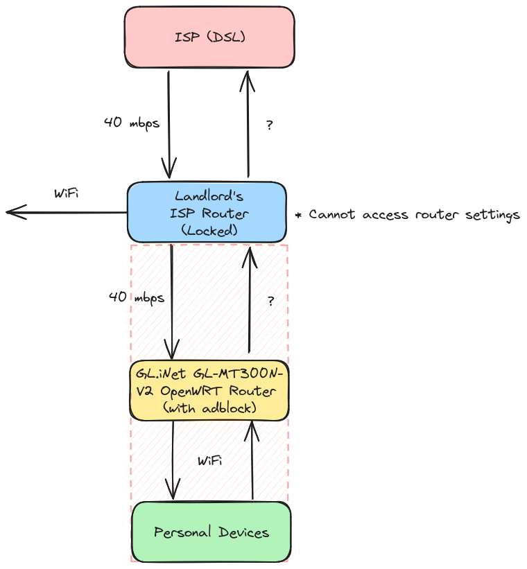 I’m in a unique situation where my landlord can’t log in to his router nor is around/cares to contact the ISP to do so. This is my current setup. Does anyone know how I might go about measuring the latency between the router and my end devices (area shaded in orange)? I’m just curious to see how much my setup is introducing in terms of online games and what not.