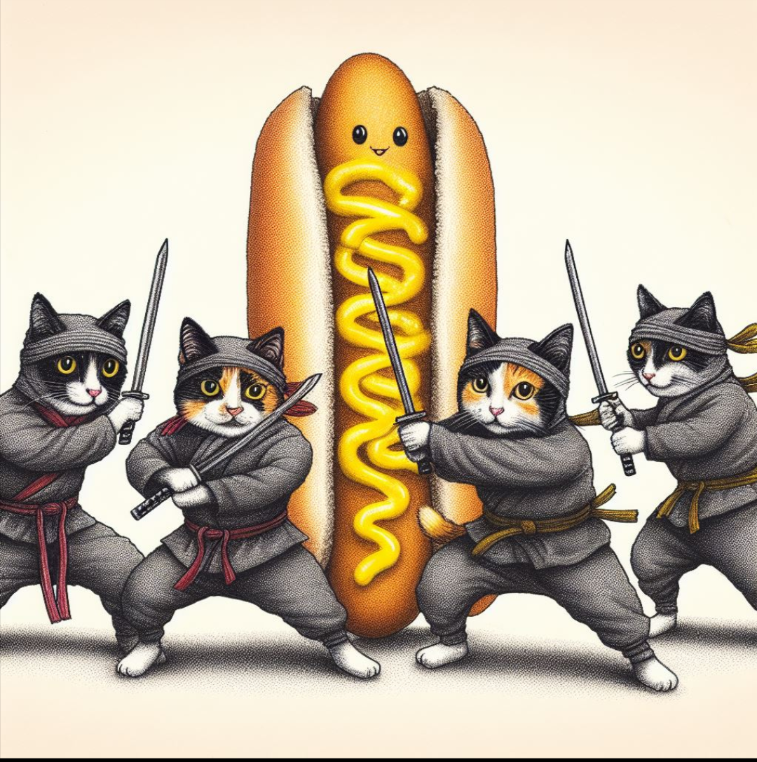 Hotdogs fails to pay for its new body guards. Next panel is just 4 fattened ninja kitties