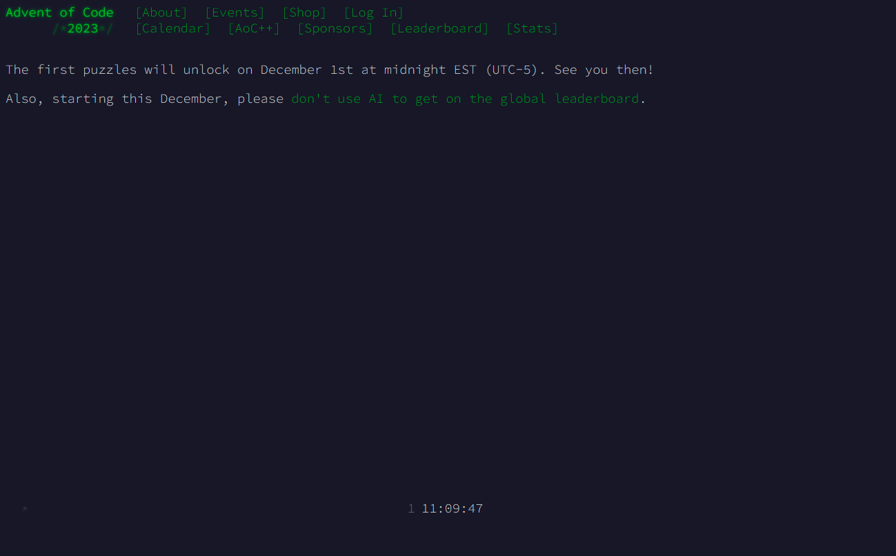 For anyone interested, advent of code is about to start! (first puzzles dropping at midnight ET which is in around 11 hours)