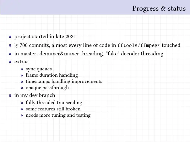 arrow-up1144arrow-down1external-linkFFmpeg Lands CLI Multi-Threading As Its "Most Complex Refactoring" In Decadeswww.phoronix.comstarman@programming.dev to Programming@programming.devEnglish · 2 years agomessage-square7linkfedilink cross-posted to: foss@beehaw.org