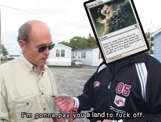I always liked that the text of this card implies that the target creature’s controller can decline to play a land if they don’t feel like it. They can just be like, nah, fuck that guy. Get him out of here, I don’t want anything for him. (I’m sure that’s also an escape hatch if the player happens to have no lands left in their library.)