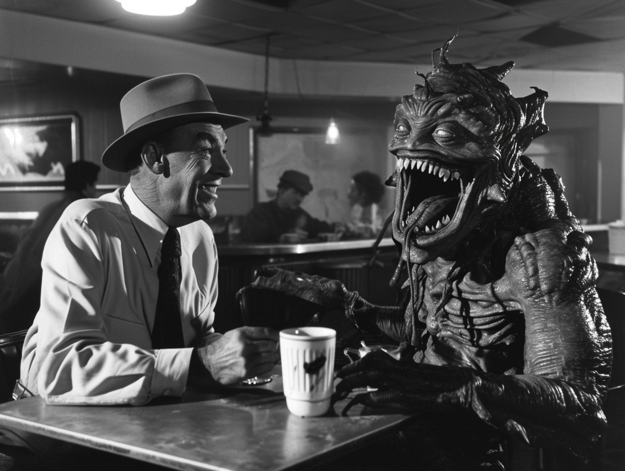 Prompt: vistavision movie still of a noir detective smiling and telling a joke to a loudly laughing alien creature with tentacles, in a diner while having coffee --ar 4:3 --v 6.0 --style raw