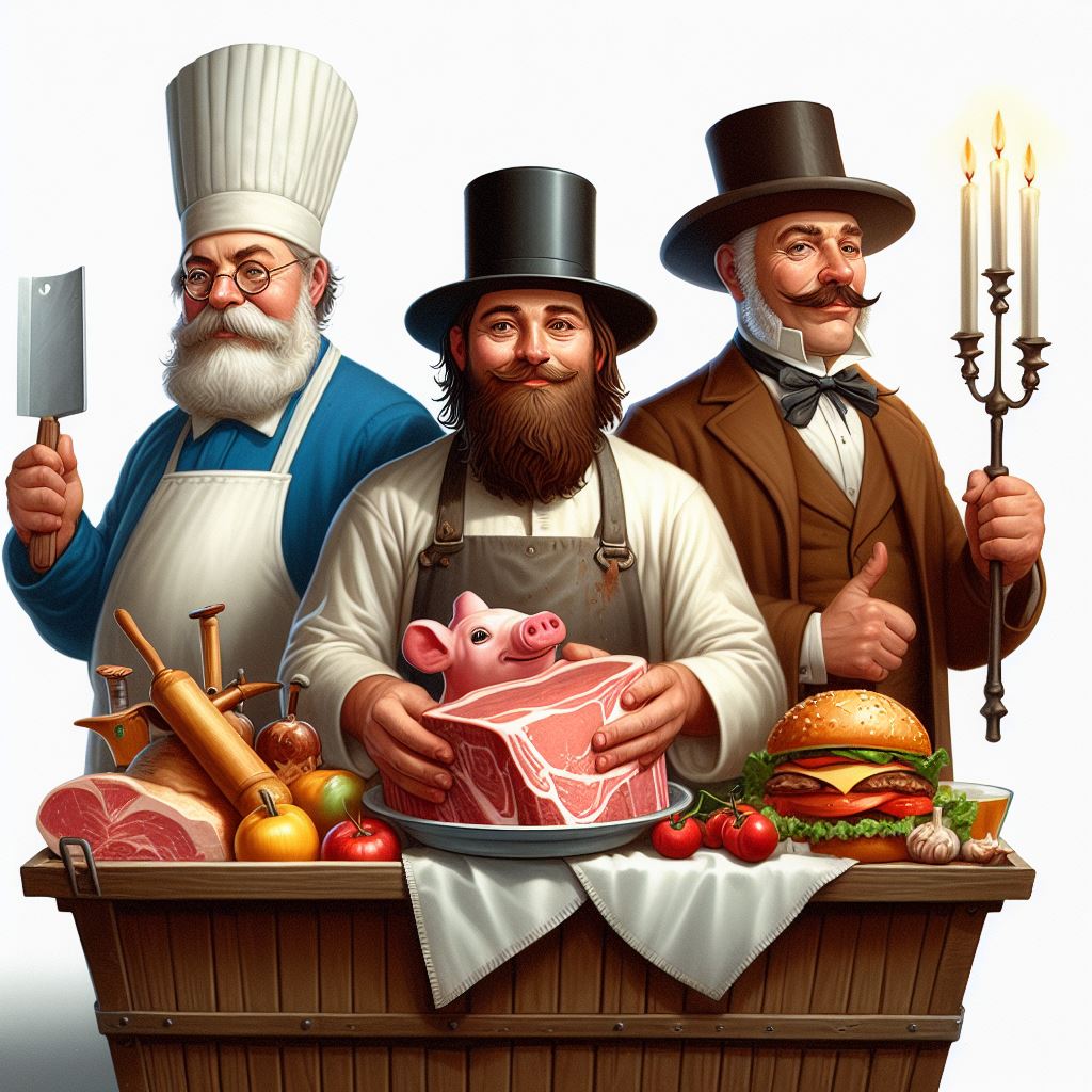 the baker’s tool is unlike any baking tool i’ve seen, it looks more like a tool for butching. none of the items in front of him are bread. the pig is too happy to have been butchered. the inclusion of a hamburger is a weird choice, not first thing that comes to mind, but it does contain bread and meat so points for relevancy. the candlestick maker is serving american gothic