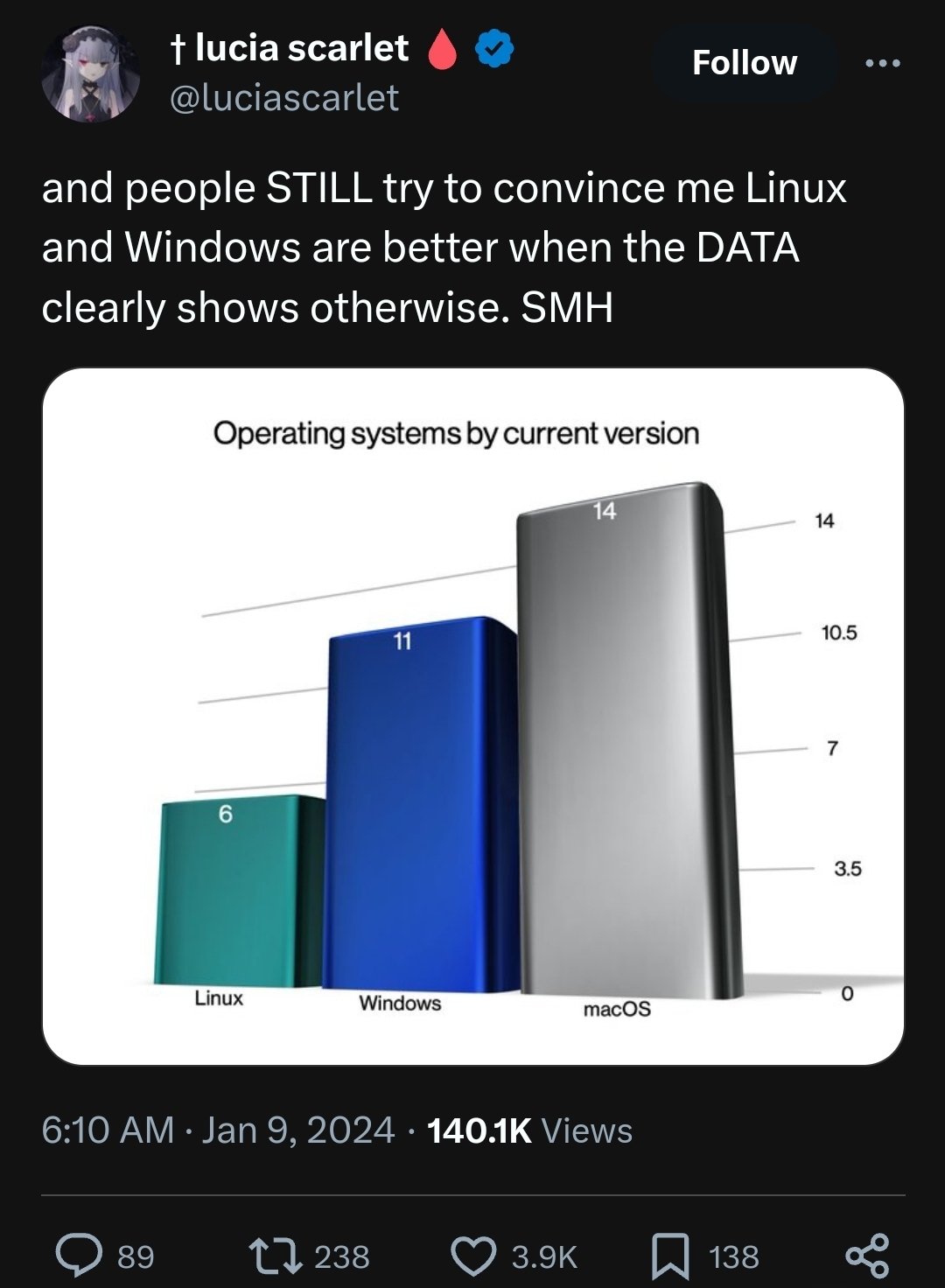 Image shows a tweet with the header “and people STILL try to convince me Linux and Windows are better when the DATA clearly shows otherwise. SMH” with an image attached showing the following:
