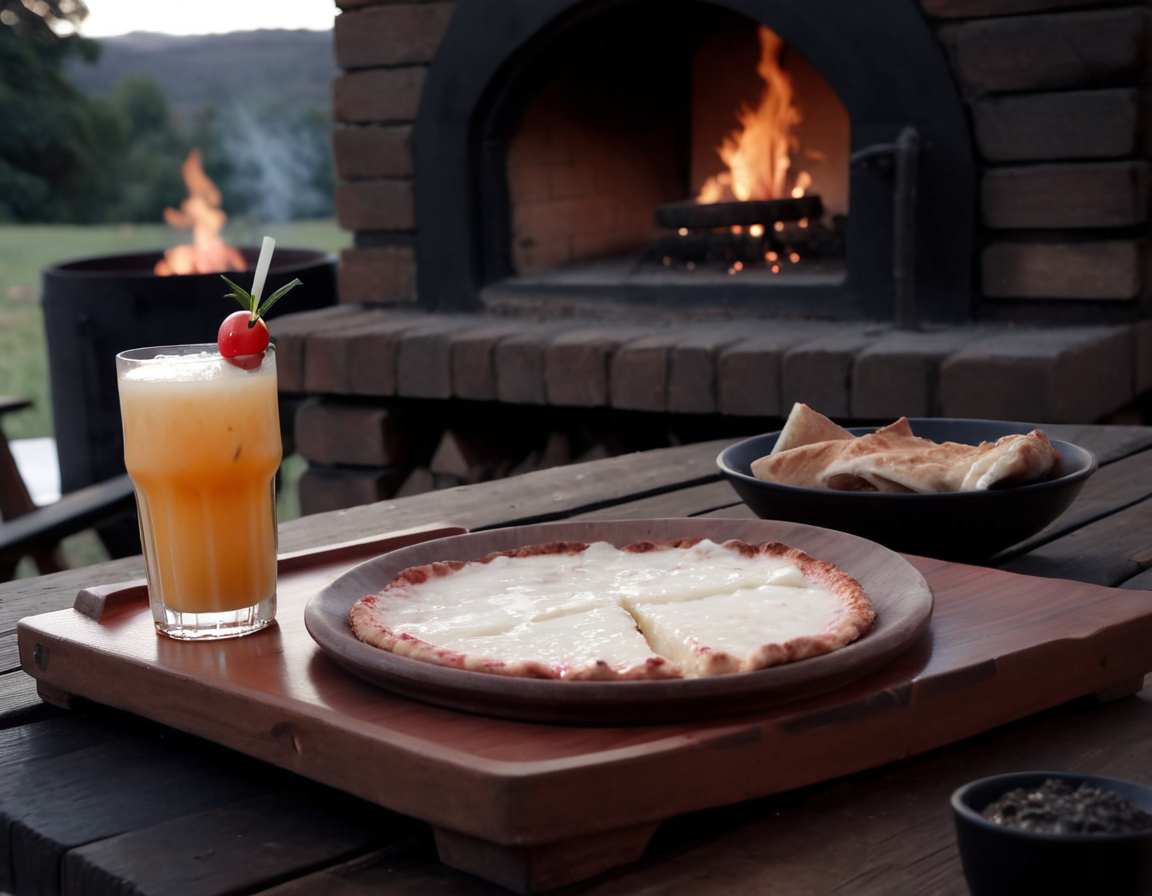 In my mind it’s a large grilled saganaki but shaped like a pizza, lightly fried bread in the back paired with an olive dip up front, and a ginger & guava drink.