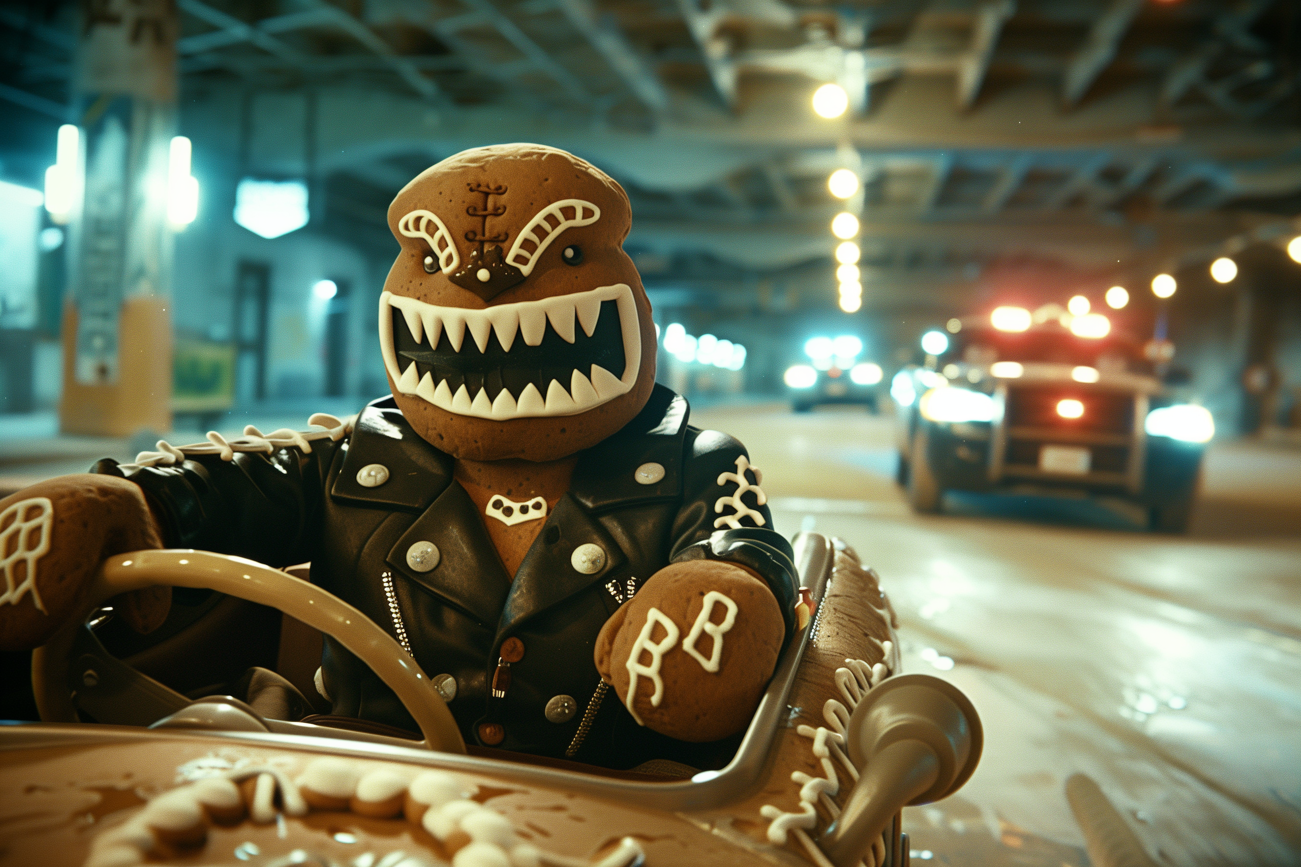 Prompt: action movie still, of A gangster gingerbread man wearing a leather jacket, sitting behind the steering wheel of a toy convertible car, being chased by police cars in the background, high speed chase action shot, shot on 35mm film --ar 3:2 --cref https://cdn.midjourney.com/84608686-d63d-428a-a8ef-15d92cd6acc7/0_0.png