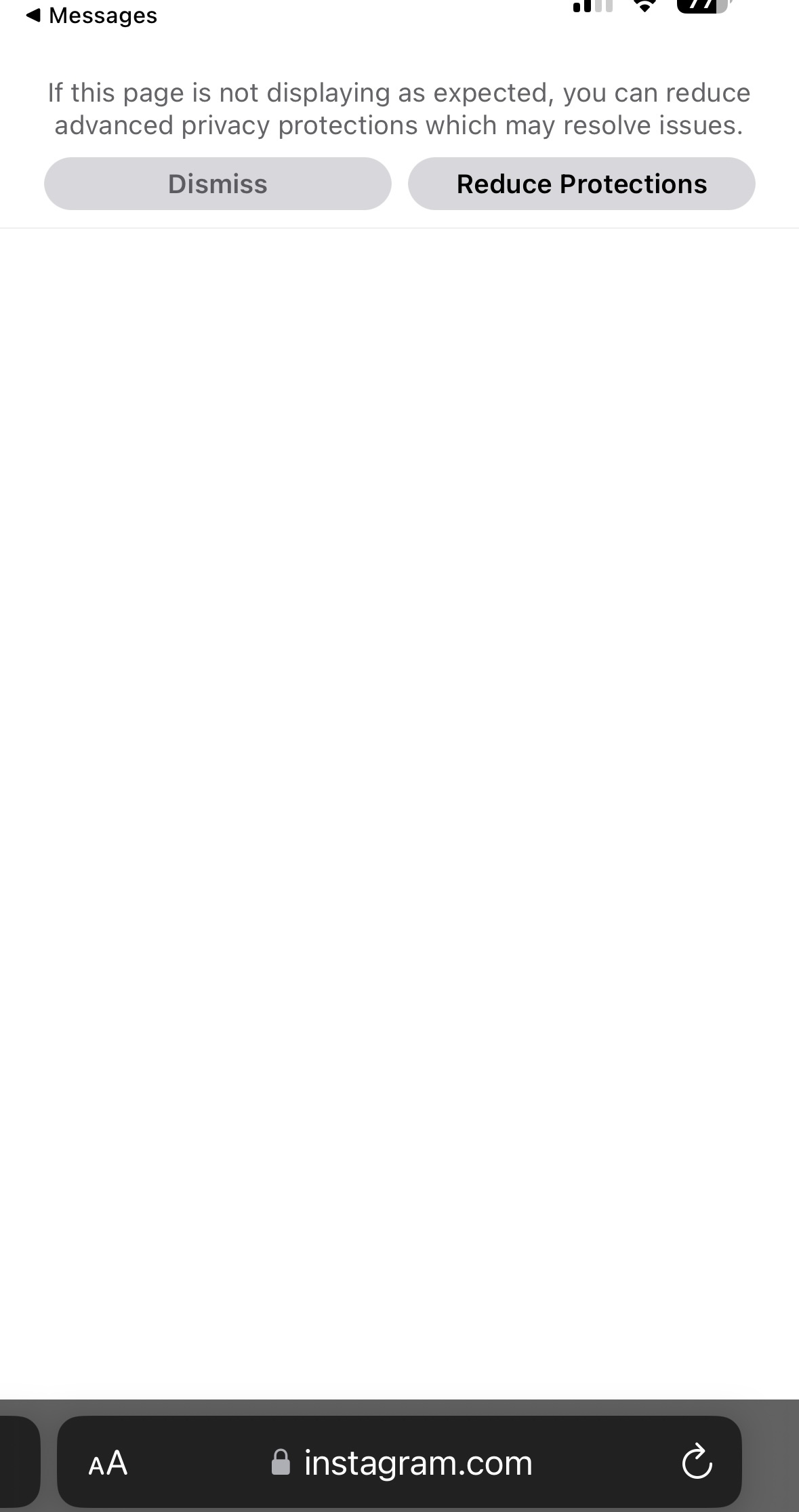 Error message when trying to view an Instagram post sent from a friend: “If this page is not displaying as expected, you can reduce advanced privacy protections which may resolve issues”.