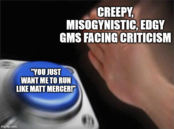 Another thing I noticed is getting more common among RPG Horror Stories. When once it was common to see entitled players complaining the GM is not running the game like Matt Mercer runs on Critical Role, I have lately seen quite few stories where problem GM tries to use that to deflect criticism. It’s usually the type to be acting creepily towards women, both in and out of game, enjoying juvenile, overtly edgy humor and/or insisting of all kinds of bigotry for “historical accurracy”. And when the players confront him (as it’s almost always a guy) about it, he’s going to say something like “Stop sucking Mercer off, this is real D&D!” or “Go play at Matt Mercer’s table, if you don’t like it!”.