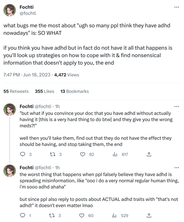 ADHD is both overdiagnosed and underdiagnosed at the same time for me… I blame misinformation and overall confusion regarding ADHD… When I talked about my symptoms to others, a common answer I would get is “common among people” - if my pratically extreme executive dysfunction and lower leg muscle destroying hyperactivity was actually common among people than the global society wouldn’t last a week