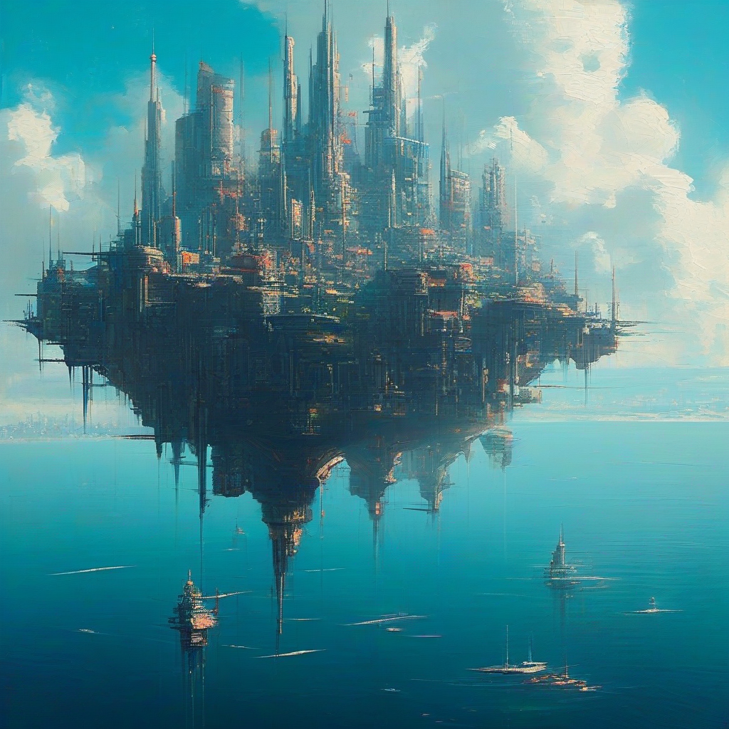 Prompt: A cyberpunk scifi painting of a floating city in the air above the sea