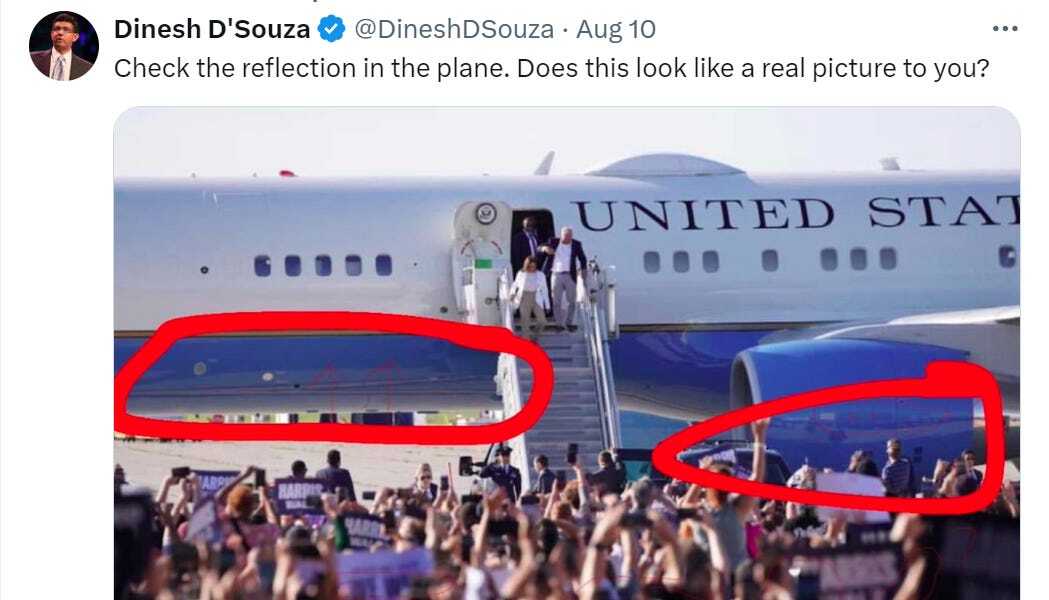 Former President Brainworms was not done*. *In a followup tweet or skeet or truth or whatever we’re supposed to call these splotches of bird diarrhea that keep plopping onto his social media, he went on an extended rant about Harris and the “mirror like finish” on Air Force Two and her fake crowds and oh Lord who knows, it’s like trying to decipher Sanskrit with him sometimes