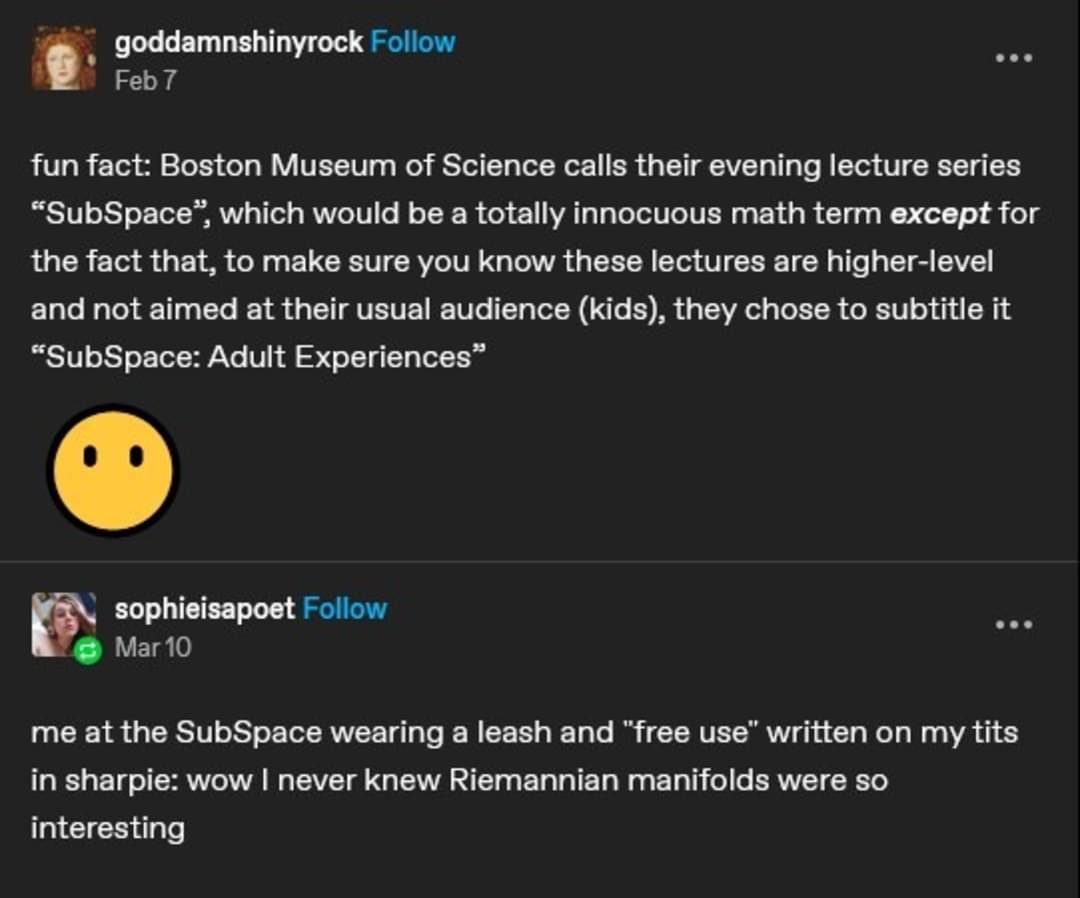minus-squaretacticalsugar@lemmy.blahaj.zonelinkfedilinkEnglisharrow-up9·1 year agoBody writing and puppy play is the only way to properly experience mathematics!