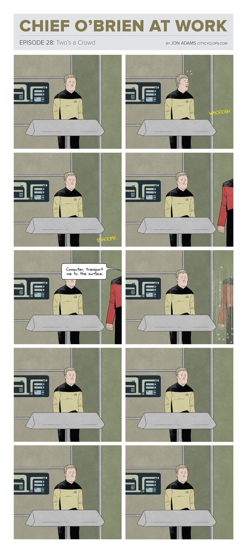 If the computer can do transports, why is O’Brian even in the transporter room? Just to suffer? Fucker doesn’t even get a chair. Stare at the wall for 8 hours, standing straight because your can’t even lean.