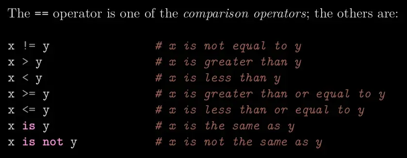 let a = 1 let b = 2 let c = 3 console.log(a == b) // prints "false" because the comparison is false console.log(a = b) // prints 2 because the expression returns the value of the assignment, which is 'b', which is 2 // Using this in an 'if' statement: if (b = c) { // the result of the assignment is 3, which is converted to a boolean true console.log("what") }You can’t do the same in Python (it will fail with a syntax error), but it’s better to adhere to convention because it doesn’t hurt anyone, but going against it might confuse programmers who have greater experience with another language. Like I was when I switched from Pascal (which uses