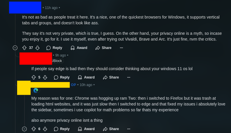 “If people say edge is bad they should consider thinking about your windows 11 os lol”
