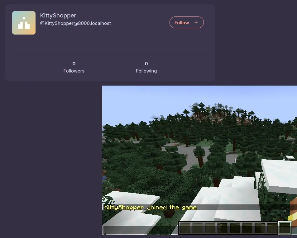 kopper [they/them]@lemmy.blahaj.zone to Fediverse@lemmy.worldEnglish · 1 year agoactivitypub in minecraft, because i had nothing better to do with my lifebrain.d.on-t.workexternal-linkmessage-square9linkfedilinkarrow-up1171arrow-down19file-text