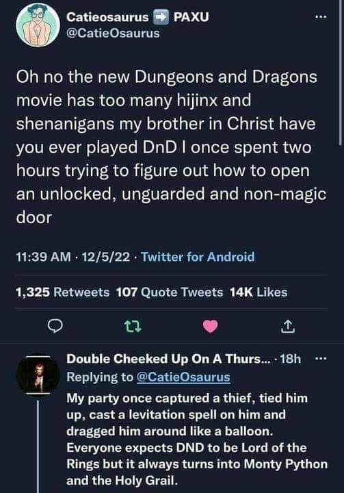 That movie was perfectly written for its target audience. Every D&D player knew what was happening, knew how it happened, and could easily imagine the DM’s exasperated facial expressions as they dragged these lunatics feet first into a good story.