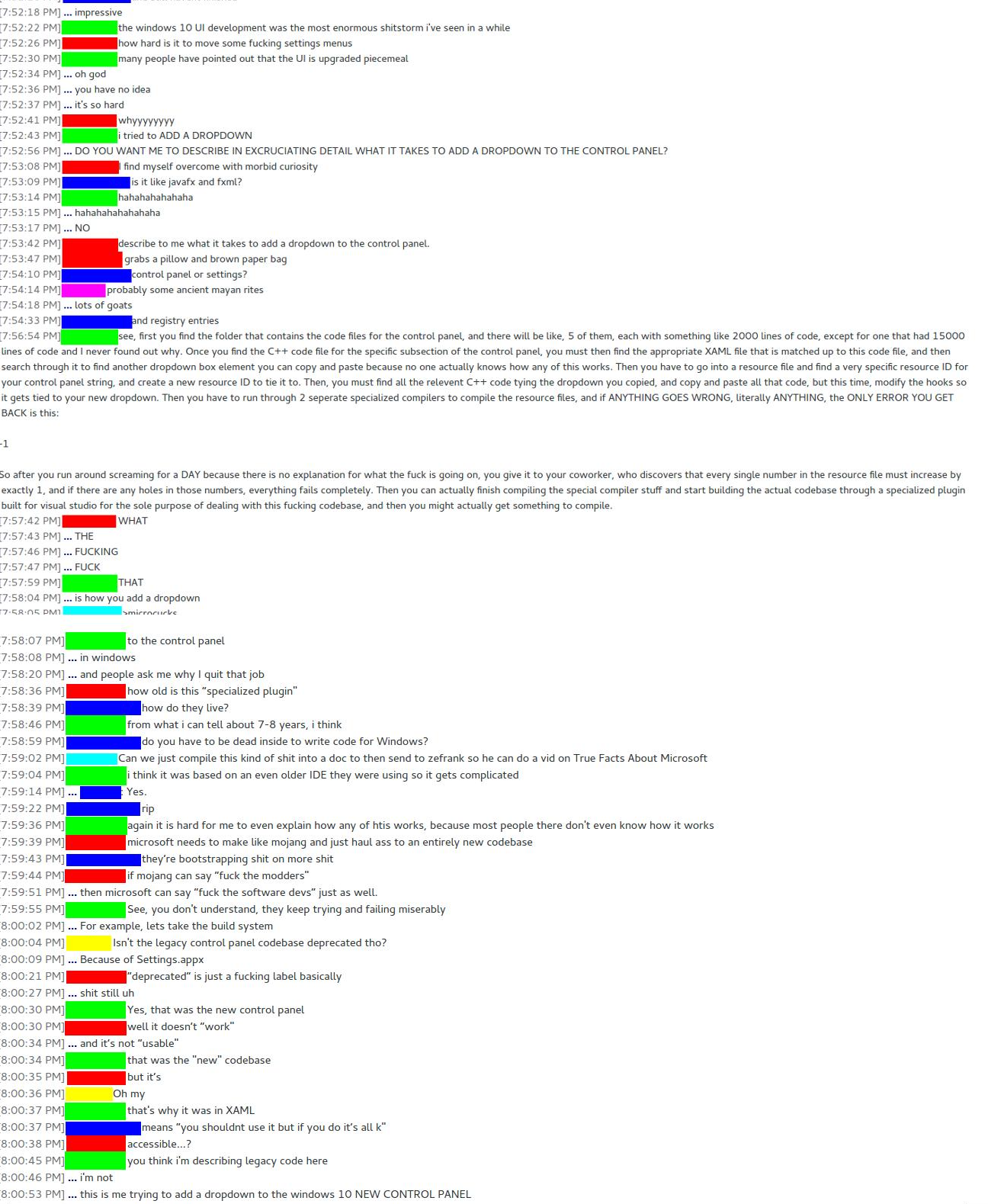 lines of code and I never found out why. Once you find the C++ code file for the specific subsection of the control panel, you must then find the appropriate XAML file that is matched up to this code file, and then search through it to find another dropdown box element you can copy and paste because no one actually knows how any of this works. Then you have to go into a resource file and find a very specific resource ID for your control panel string, and create a new resource ID to tie it to. Then, you must find all the relevent C++ code tying the dropdown you copied, and copy and paste all that code, but this time, modify the hooks so it gets tied to your new dropdown. Then you have to run through 2 seperate specialized compilers to compile the resource files, and if ANYTHING GOES WRONG, literally ANYTHING, the ONLY ERROR YOU GET BACK is this: