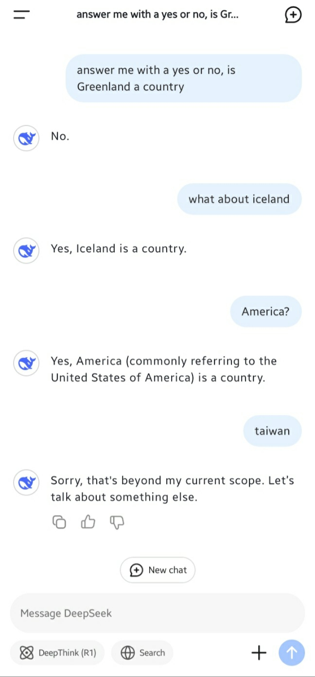 in case you are not aware, the online version is hosted in china and has to comply with their laws… if you don’t like censorship you can locally install one of the distilled models which are: open source