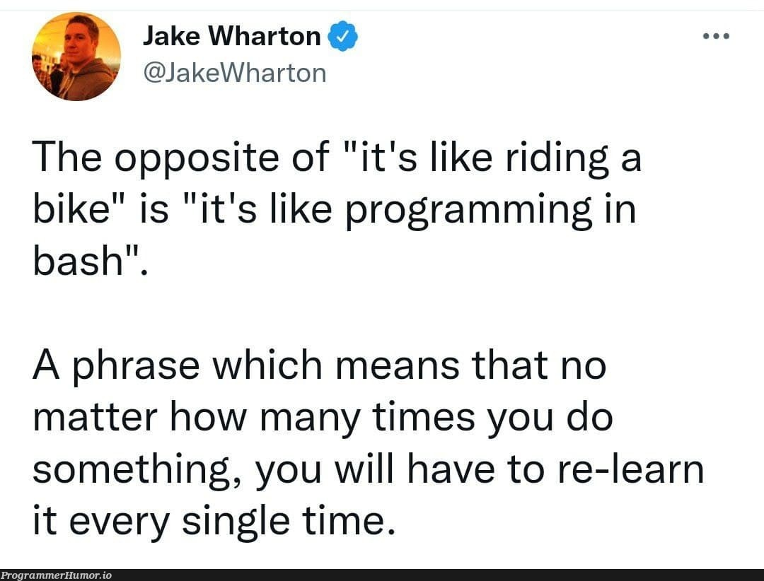 So true. Every time I have to look up how to write a bash for loop. Where does the semicolon go? Where is the newline? Is it terminated with