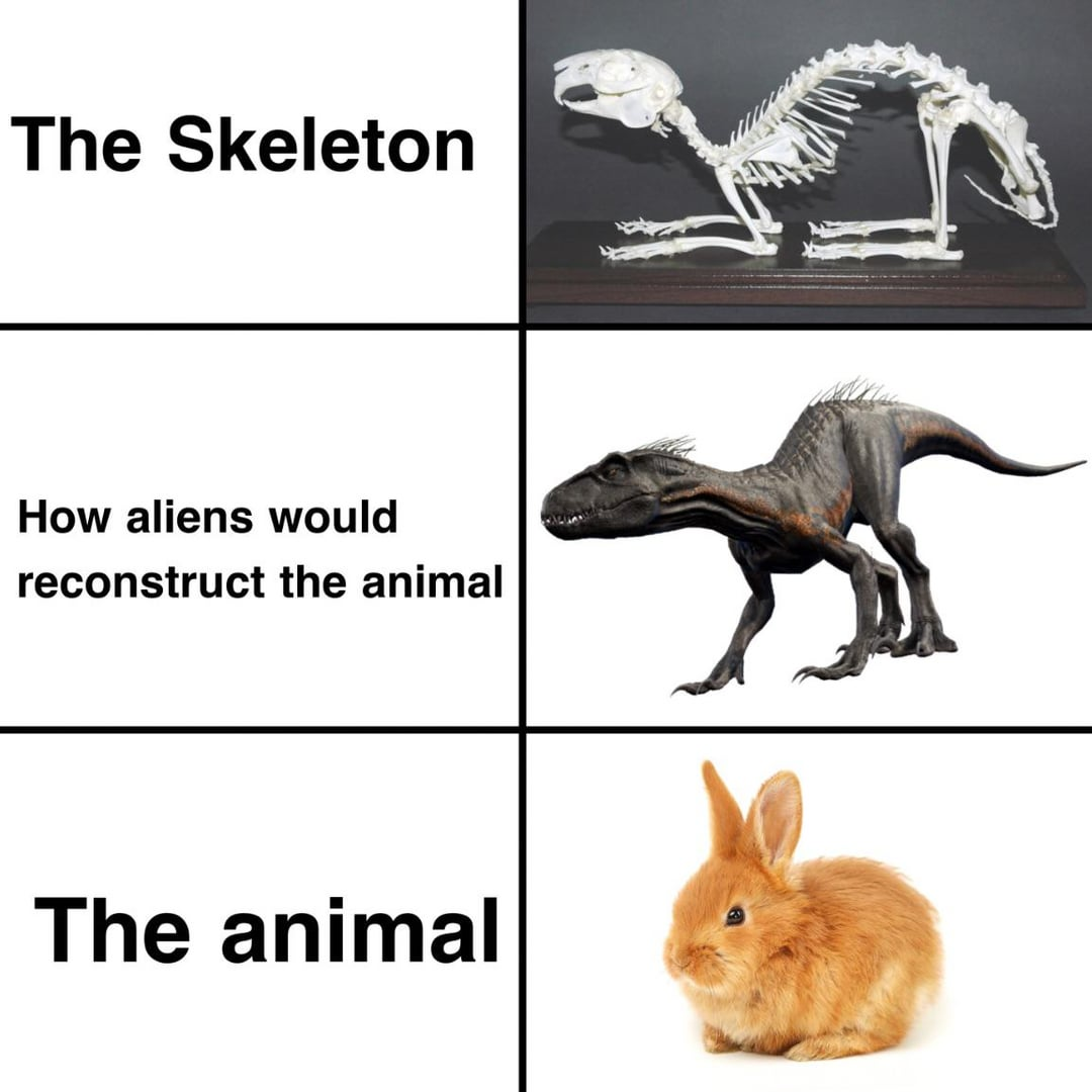 The idea is that aliens find skeletons of animals we’re more familiar with and come to the same kind of wildly mistaken conclusions about them that we might have if we’d found rabbit skeletons without having first hand experience of modern rabbits.