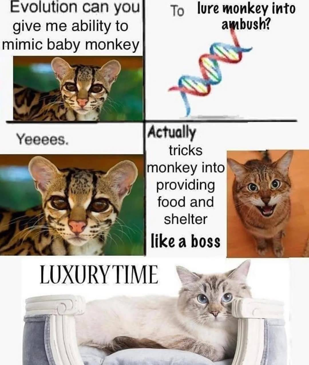 Incidentally I don’t think this is actually evolution; more learned behavior. They repeat the tone we respond to the most. My cat also bites my foot when he wants attention because he has learned that it’s hard for me to ignore.