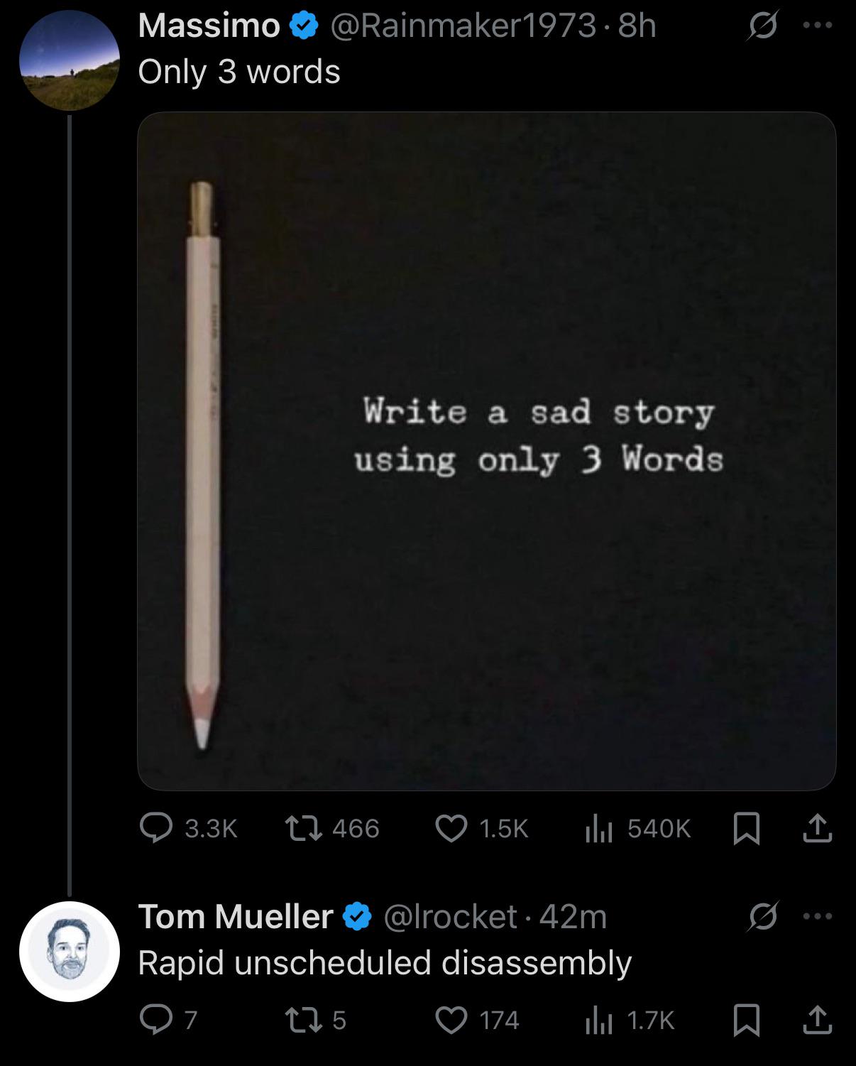 threelonmusketeers@sh.itjust.worksM to SpaceflightMemes@sh.itjust.worksEnglish · 8 months agoOnly three wordssh.itjust.worksimagemessage-square50linkfedilinkarrow-up1276arrow-down16file-text
