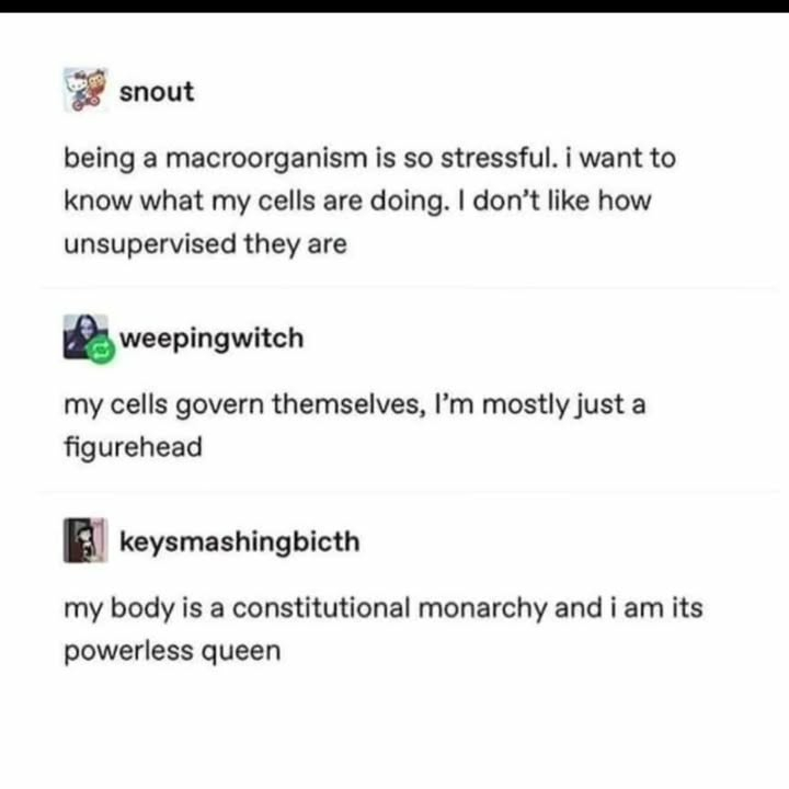 My cells know better than to start any shit. They saw what I did to the appendix when he started acting up.