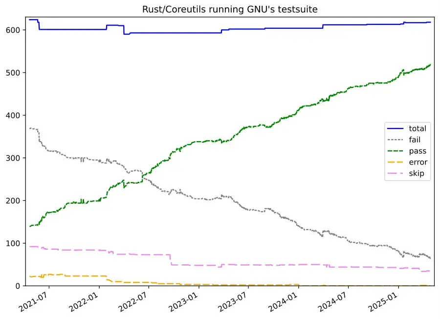 cat,ls, etc are written in rust. Relevant repo dir: https://github.com/uutils/coreutils/tree/main/src/uuThe original CoreUtils have beenvetted through decades of use. They have been broken and fixed many times, and they have been hardened against so many edge cases, it’s not funny anymore. That’s where those 600 tests come from (mostly). Once they have brought the Rust tools to that level, how much performance advantage will there be left?