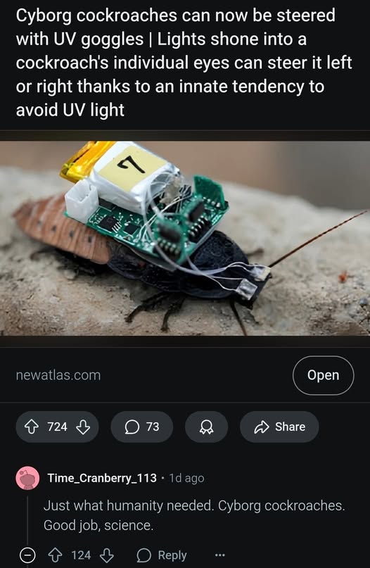 Turns out that did some weird things to YouTube’s algorithm… it basically poured ‘surgery’ and ‘weird nerdy shit’ into the same cup, and started making some of the most fucked up video recommendations I’ve ever seen… one of which was a video of a guy giving anesthesia to a cockroach with ice water, and then sticking a diode or something into its little roach brain that connected to a circuit board backpack like the one shown in the OP. He could then use a remote to stimulate two different parts of its brain or something, and if he did this while it was running, it would reliably turn left or right, so… remote control cockroach.