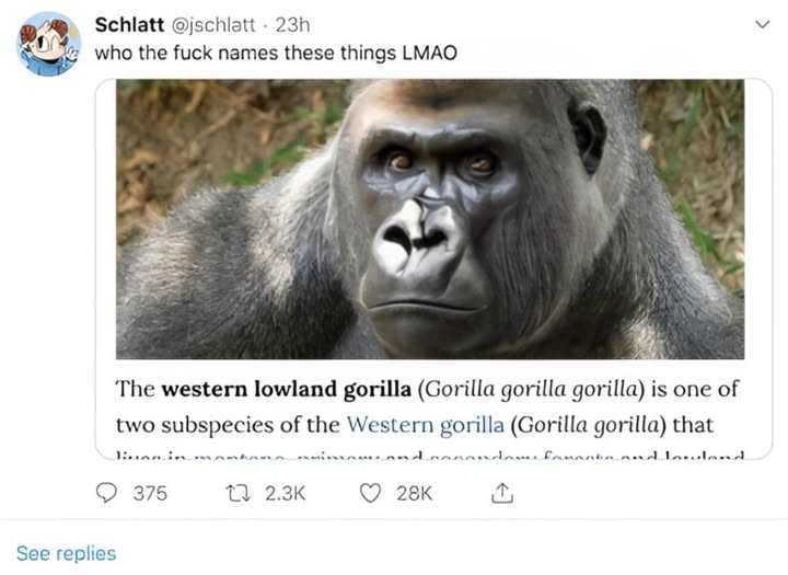 The guy who named it was running away from it in a panic at the time. “AH FUCK! GORILLA! GORILLA GORILLA GORILLA!”