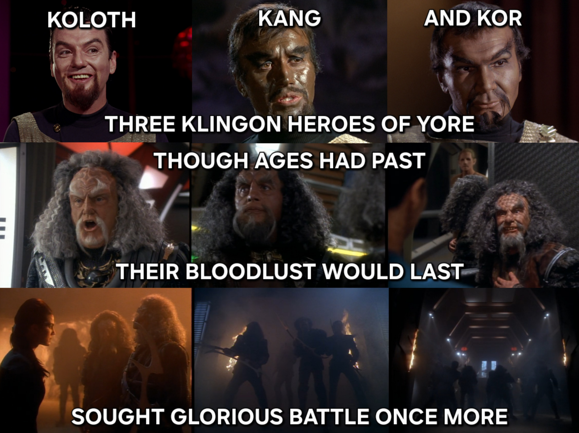 DS9 s2e19 “Blood Oath” featuring returning TOS actors William Campbell (Koloth, s2e15 “The Trouble with Tribbles,” also played Trelane), Michael Ansara (Kang, s3e7 “Day of the Dove”), and John Colicos (Kor, s1e26 “Errand of Mercy”)