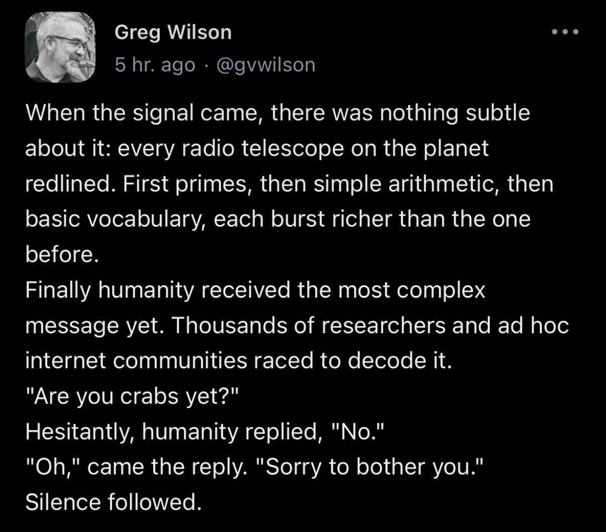 I think the meme is funny too, but it seems like it’s becoming so divorced from its original context that some people actually believe that carcinisation is some kind of ideal endpoint of evolution. Just to clarify: this isn’t true given how few, localized actual examples there are and the tradeoffs involved.