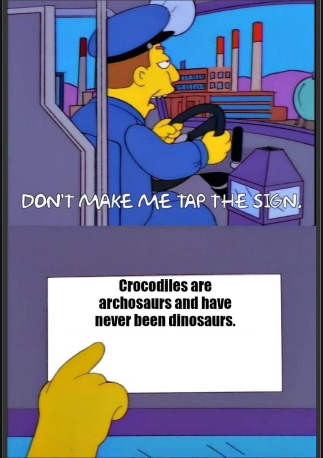 And that’s not what Mr Driver’s sign is talking about. He’s talking about crocodiles. So even if dinosaurs are archosaurs, it’s completely irrelevant to the point