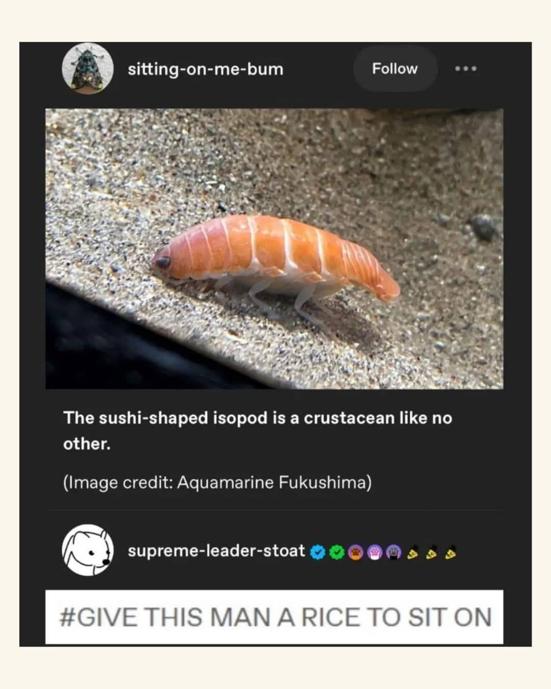 minus-squareBigTurkeyLove@lemmy.worldlinkfedilinkEnglisharrow-up5·7 months agoProbably tastes like shrimp