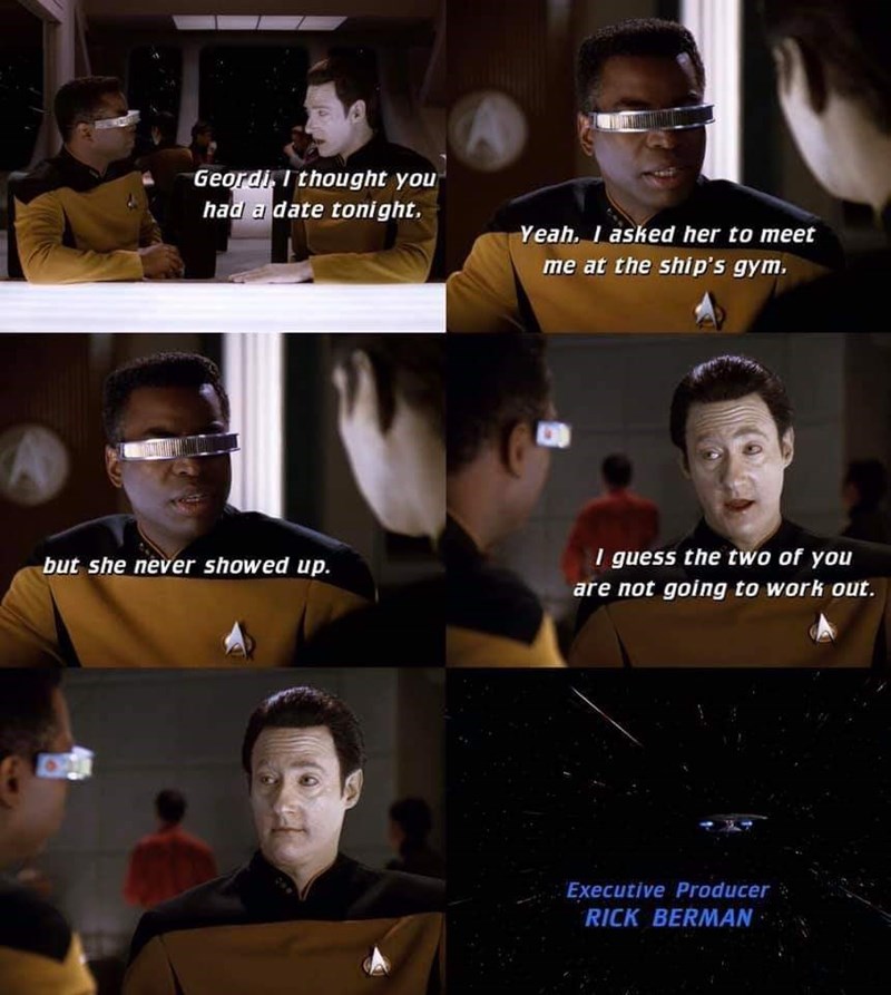 LaForge: Data, I appreciate that you want to help, but I’m not in the mood for jokes right now.