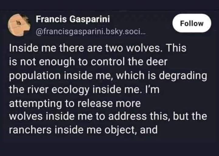 I have two chimps inside me. They keep flinging shit at each other. And then devour the faces of whoever comes close to them.