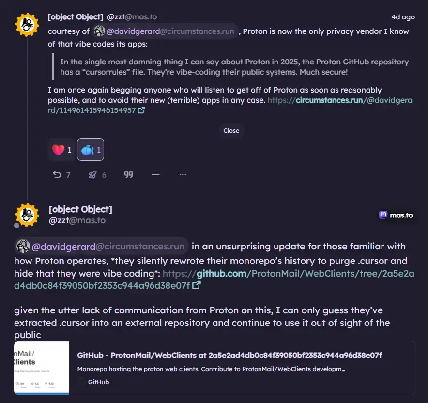 A post by [object Object] (@zzt@mas.to) saying: courtesy of @davidgerard@circumstances.run, Proton is now the only privacy vendor I know of that vibe codes its apps: In the single most damning thing I can say about Proton in 2025, the Proton GitHub repository has a “cursorrules” file. They’re vibe-coding their public systems. Much secure! I am once again begging anyone who will listen to get off of Proton as soon as reasonably possible, and to avoid their new (terrible) apps in any case. https://circumstances.run/@davidgerard/114961415946154957