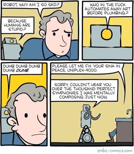 minus-squareUnculturedSwine@lemmy.dbzer0.comlinkfedilinkEnglisharrow-up13arrow-down1·5 months ago“Automating plumbing” sounds like a good way to literally enshittify your house. Also, it doesn’t matter how many symphonies you compose if no one wants to listen to them.