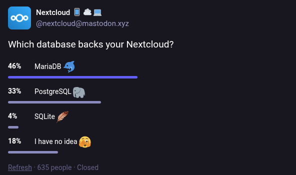 Nextcloud asked in a poll at https://mastodon.social/@nextcloud@mastodon.xyz/115095096413238457 what database its users are running. Interestingly one fifth replied they don’t know. Should people know better where their data is stored, or is it a good thing everything is running so smoothly people don’t need to know what their software stack is built upon?