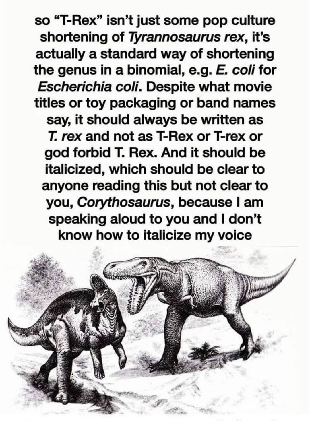 minus-squareTempermentalAnomaly@lemmy.worldlinkfedilinkEnglisharrow-up11·4 months agoFake. First, Corythysaurus would have blasted his ass with a sonic boom before he could even have really started. Seriously. BLASTED. HIS. ASS Second, they loved about 10 million years apart. That may not seem like much to us fellow humans, but in dinosaur years, its scientifically notable. Finally, while T. rex’s English was quite good, it’s vocabulary was limited. source