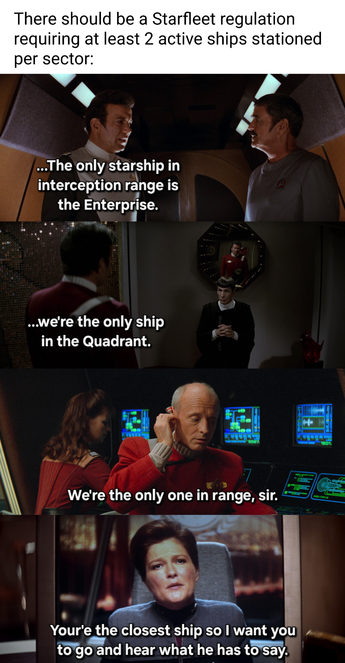 I remember a list of things you never see on Star Trek, and one item was, “There’s a nearby emergency, but another ship is available and can deal with it to everyone’s satisfaction.”