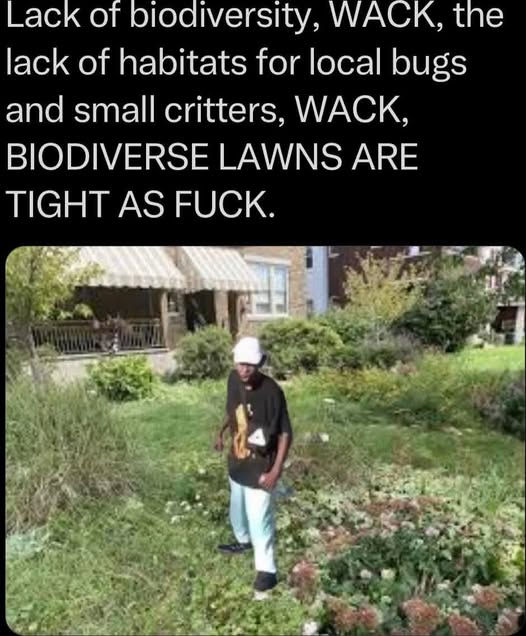 I’ve been promoting a “mullet yard” where the first little part by the street is standard monoculture mowed grass and then 8-10’ back it’s a riot of natural plants. The contrast kind of works for it.