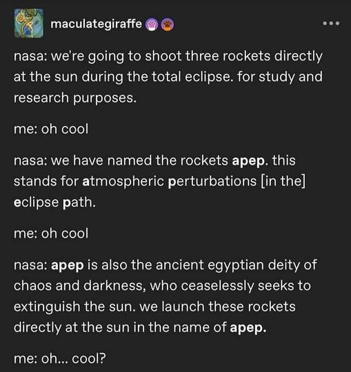 Apep… I mean… I get why they’d want to extinguish the sun, I can’t imagine they had a good time in grade school with a name like “Apep…”