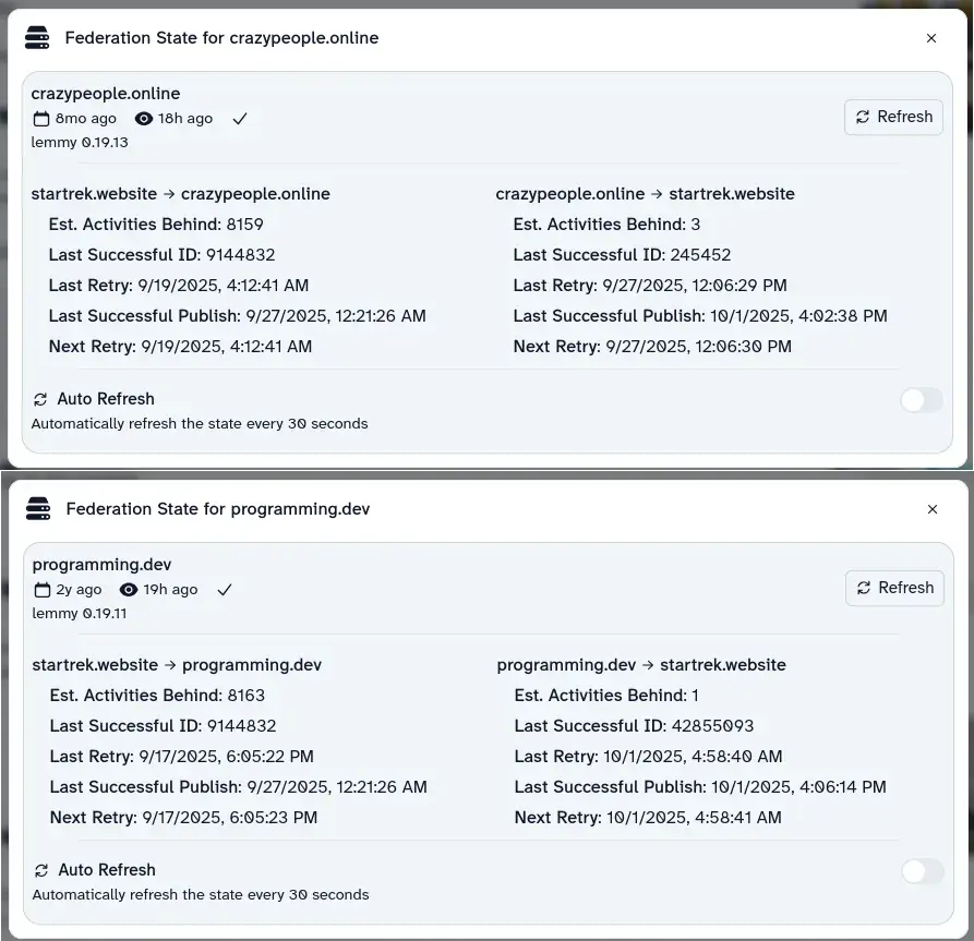 Noticed yesterday that a post to a community on programming.dev wasn’t getting any traction. Not even the single downvote every post gets. Same for a post to crazypeople. Looked at the communities on their respective home instances, and neither were there. So I pulled up the federation stats, and both were 6,000-ish behind and now that’s up to 8,000-some on both.