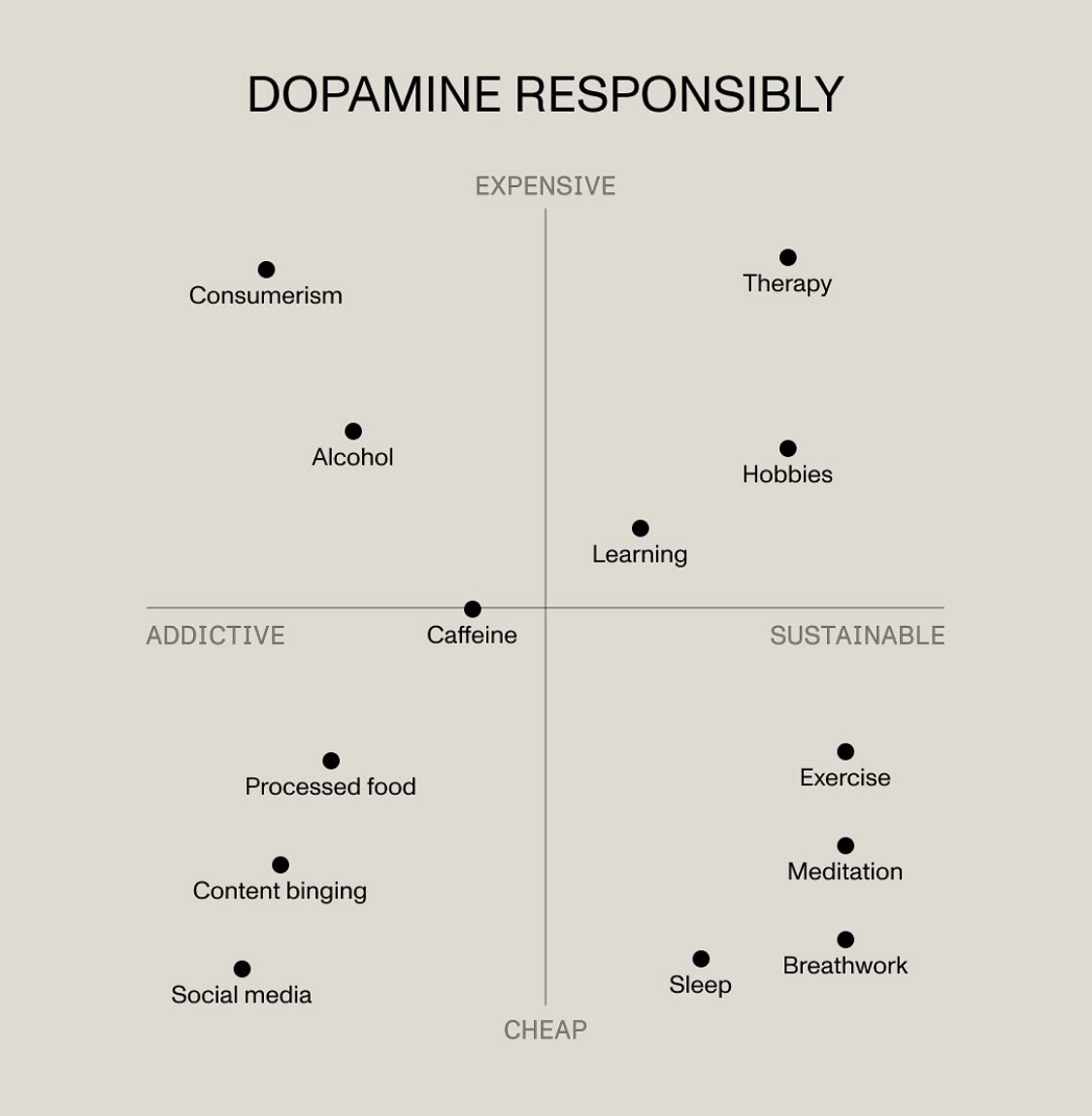 I think we might need to add a few more axises, as we’re missing one for “potency” and one for “accessibility”. Sleep and exercise tend to require a large chunk of uninterrupted time and focus. Breathwork and meditations great for getting through a short-term spike in stress but significantly less potent than caffeine, food, or alcohol. Quality therapy is good precisely because it is supposed to be highly potent in relatively small doses. But, even more than cost, its often something a prospective patient struggles to find.